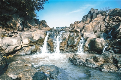 走入百仞灘,隨處可見小溪流淌、泉水叮咚的美景。這里的景致自然形成,沒有絲毫人為的華麗,更有一絲淳樸的味道。偶爾在叢林里,可見古人們搭建的過河石橋,走在鋪滿一層綠意的石板上,腳踩青苔,嗅到的是林子里草木的清新。