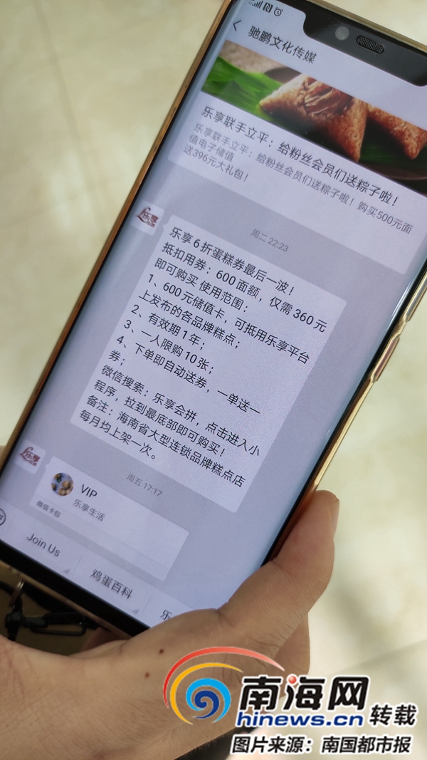 南國(guó)都市報(bào)5月19日訊(記者 王康景 文/圖)??谝还就ㄟ^(guò)“樂(lè)享團(tuán)購(gòu)”活動(dòng),發(fā)展線(xiàn)下“團(tuán)長(zhǎng)”吸引群眾“入群”參與各類(lèi)優(yōu)惠卡團(tuán)購(gòu)活動(dòng),包括加油卡、超市購(gòu)物卡、糕點(diǎn)店卡、水果品牌連鎖店購(gòu)物卡等等,按照6折至9折不等的優(yōu)惠出售給“團(tuán)員”。然而,很多人付款后發(fā)現(xiàn),公司不及時(shí)發(fā)卡,或者所發(fā)卡并無(wú)金額。19日,海口不少參加團(tuán)購(gòu)優(yōu)惠卡的市民向公安機(jī)關(guān)投訴海南馳鵬文化傳媒公司涉嫌欺詐和非法集資,所涉金額數(shù)百萬(wàn)元。目前,事件還在進(jìn)一步調(diào)查中。