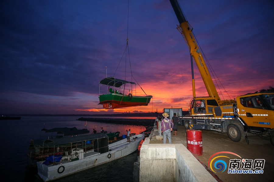 萬寧市烏場港碼頭,起重機把一艘艘漁船吊上岸避風。海報集團全媒體中心記者 袁琛 攝