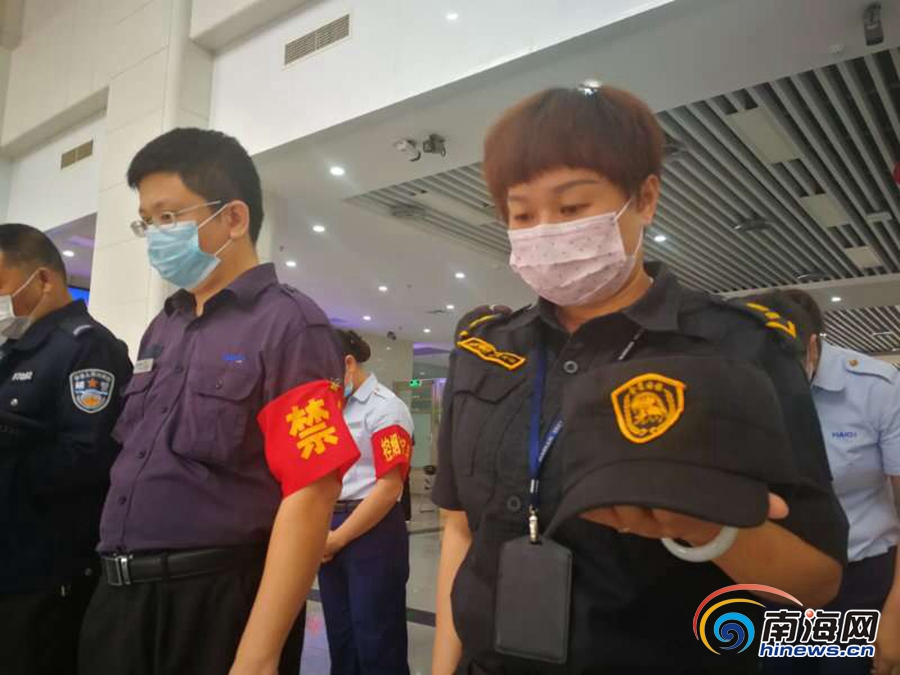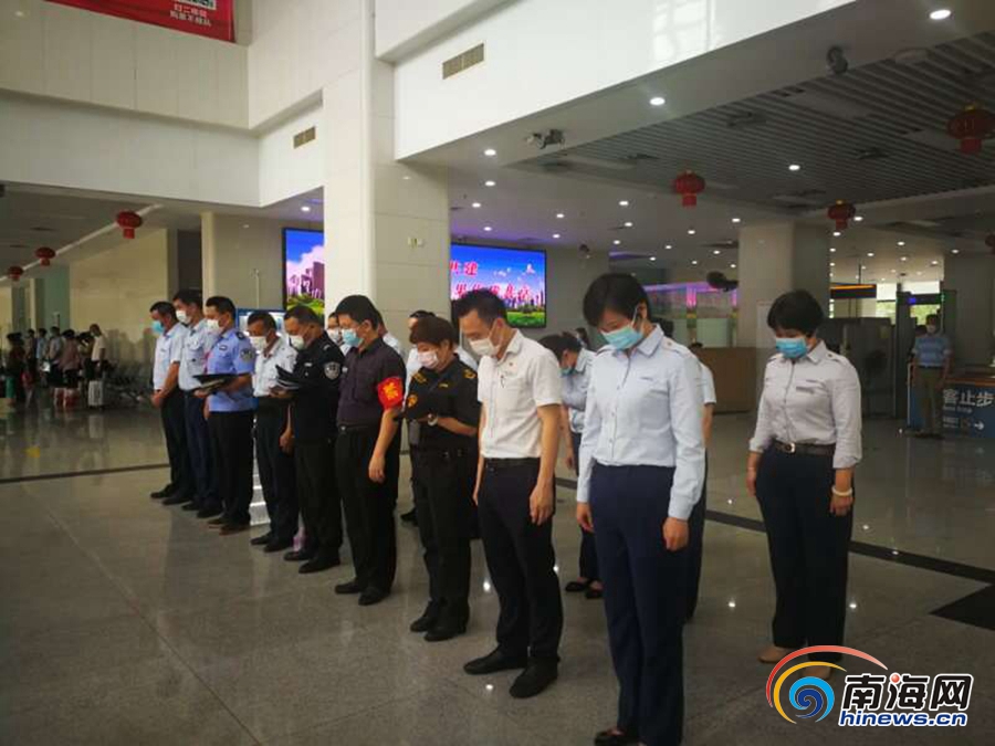 椰視頻 | 海口汽車客運總站候車大廳內 工作人員和乘客低頭默哀