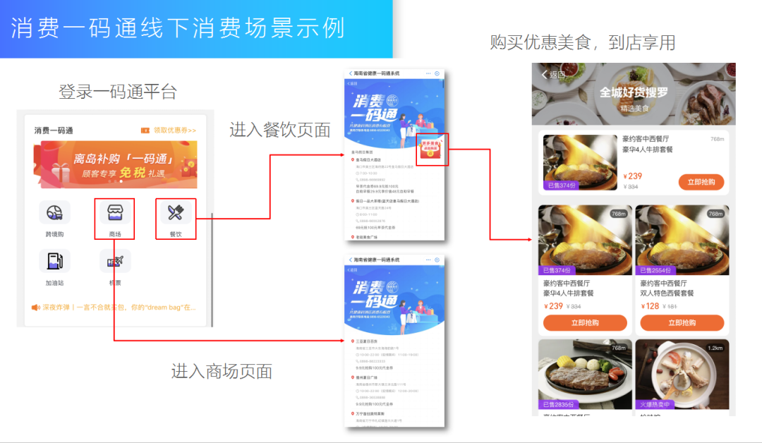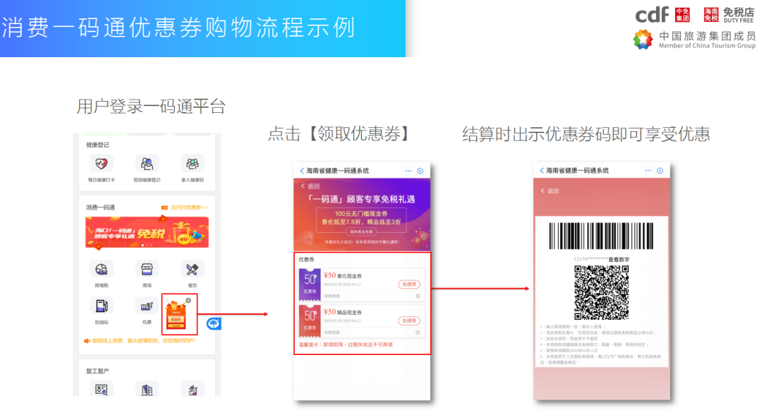 當天,中免集團、中國石化、中國銀聯、海南航空以及省內餐飲、商場、便利店等各類商家將通過“消費一碼通”發放約3000萬元優惠券,省內外居民在登錄后每人可領取210元消費券大禮包,其中包括100元免稅現金券、20元跨境購消費券、70元中石化消費券以及20元航空消費券。消費券不僅可以在線上購物,還可在實體店付款時抵扣,滿足廣大消費者的購物消費需求。