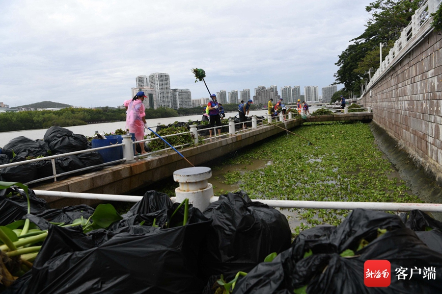 新海南客戶端、南海網、南國都市報6月17日消息 (記者 沙曉峰)6月17日,工作人員和志愿者在三亞河畔打撈水浮蓮。