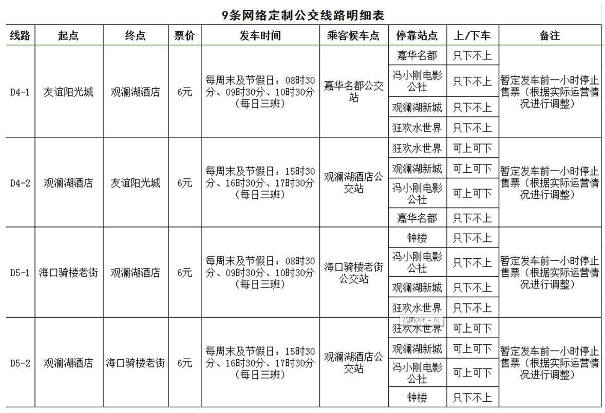 據了解,海口公交集團經過充分調研及需求聚合分析,開通D1(市黨校至宜欣廣場)、D2(海景花園至大潤發國貿店)、D3(省醫院龍華門診部至省醫院留醫部)、D4(友誼陽光城至觀瀾湖酒店)等9條網絡定制公交線路。