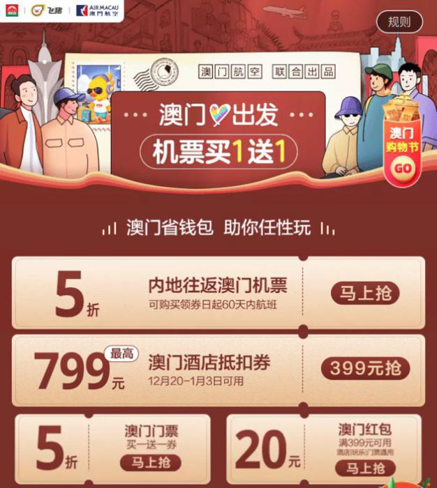 新海南客戶端、南海網(wǎng)、南國都市報(bào)12月18日消息(記者 吳興)隨著跨年時(shí)間的臨近,旅游業(yè)將迎來新的黃金期。作為年內(nèi)唯一開放的出境游目的地,澳門成為不少人的跨年選擇。近日,飛豬聯(lián)合澳門航空等在機(jī)票“買一送一”基礎(chǔ)上,優(yōu)惠力度再加碼,推出了機(jī)票折上立減活動(dòng)。同時(shí),飛豬“隨心飛”機(jī)票首次新增澳門專線,再次拉低內(nèi)地游客去澳門旅游的成本。