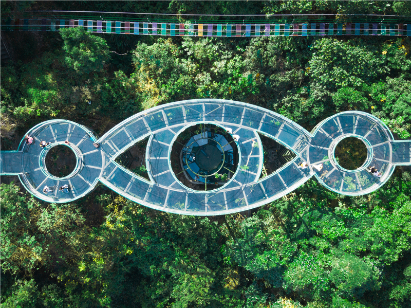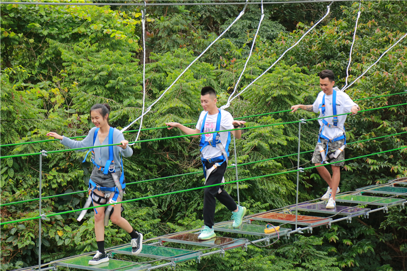 而與雨林天眼“并駕齊驅(qū)”的“步步驚心”體驗(yàn)項(xiàng)目,長度、高度與“雨林天眼”保持一致,不同之處在于,該項(xiàng)目的彩色玻璃踏板懸空隔開,高空俯瞰就像一條七彩的“紐帶”,在雨林山澗此起彼伏。云霧繚繞中,玩家在安全套索的保護(hù)下,腳踏彩色橋面玻璃板,顫顫悠悠躡行于U形山谷之上,玩家步幅的晃動(dòng)會(huì)與橋面共振,產(chǎn)生心理震顫感,帶給玩家“一步一心跳”的刺激感。俯視雨林深處,“步步驚心”橋面既像一道彩虹橫空而過,又恍如彩虹飛蝶翩翩起舞,美輪美奐而令人心馳神往。