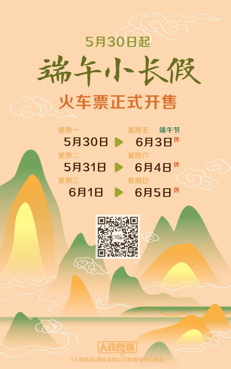 另?yè)?jù)記者從廣鐵集團(tuán)獲悉,端午小長(zhǎng)假火車票30日起預(yù)售。車票預(yù)售、列車開行等服務(wù)資訊,請(qǐng)以鐵路12306網(wǎng)站、鐵路12306App或車站公告為準(zhǔn)。有出行需求的旅客,請(qǐng)?zhí)崆傲私獬霭l(fā)地、目的地最新防疫政策,關(guān)注列車開行情況,合理規(guī)劃出行。