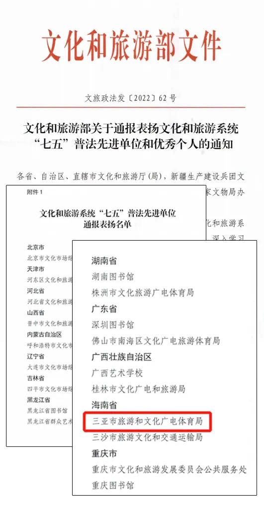 三亞市旅游和文化廣電體育局榮獲全國文旅系統“七五”普法先進單位